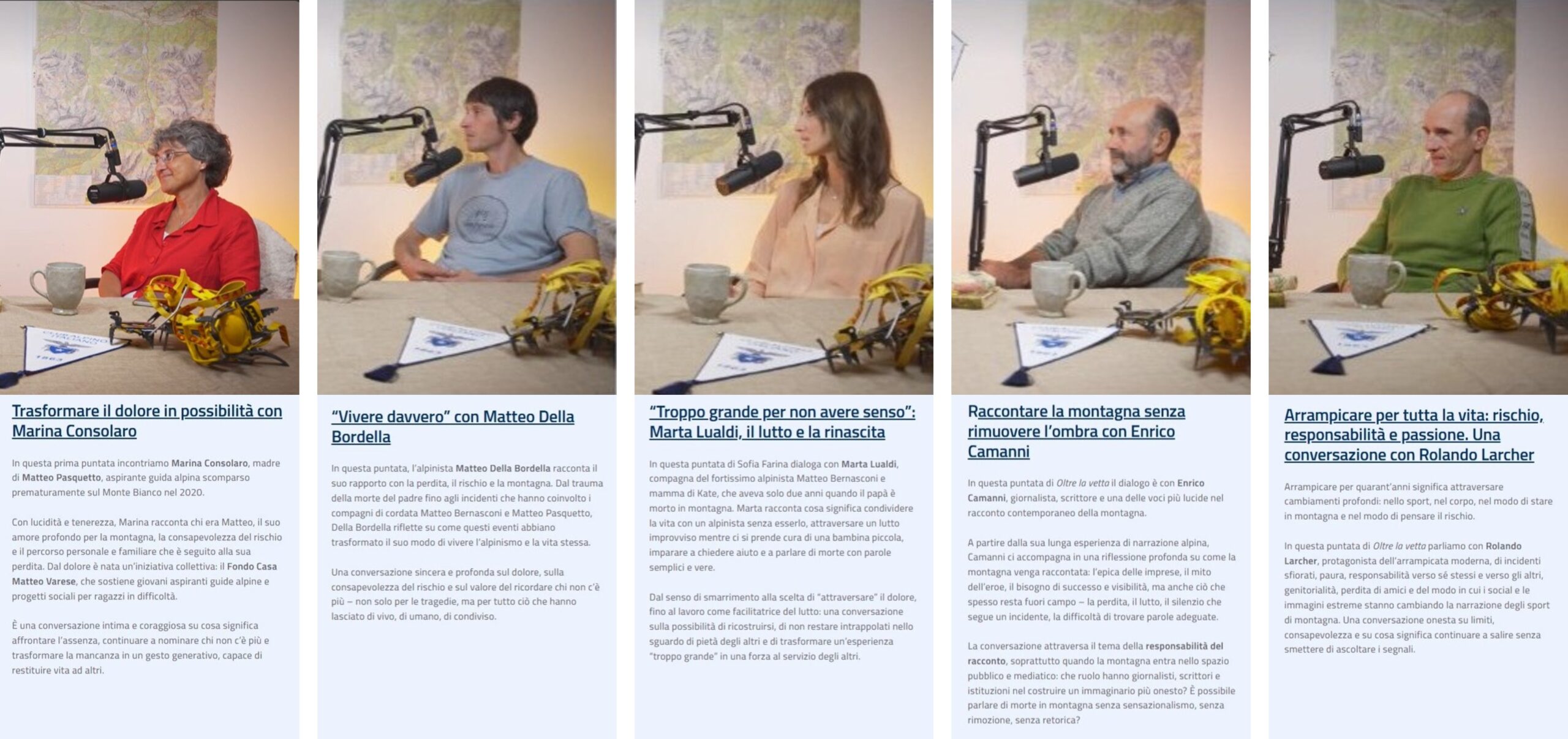 Dal sito si arriva facilmente anche alla sezione dei podcast. Oltre a quello che riguarda la nostra vicenda, c’è l’intervista a Matteo della Bordella, quella a Marta Lualdi, compagna di Matteo Bernasconi, a Enrico Camanni, giornalista, scrittore e una delle voci più lucide nel racconto contemporaneo della montagna, a Rolando Larcher, protagonista dell’arrampicata moderna e a Emanuele Andreozzi, alpinista forte e riservato.