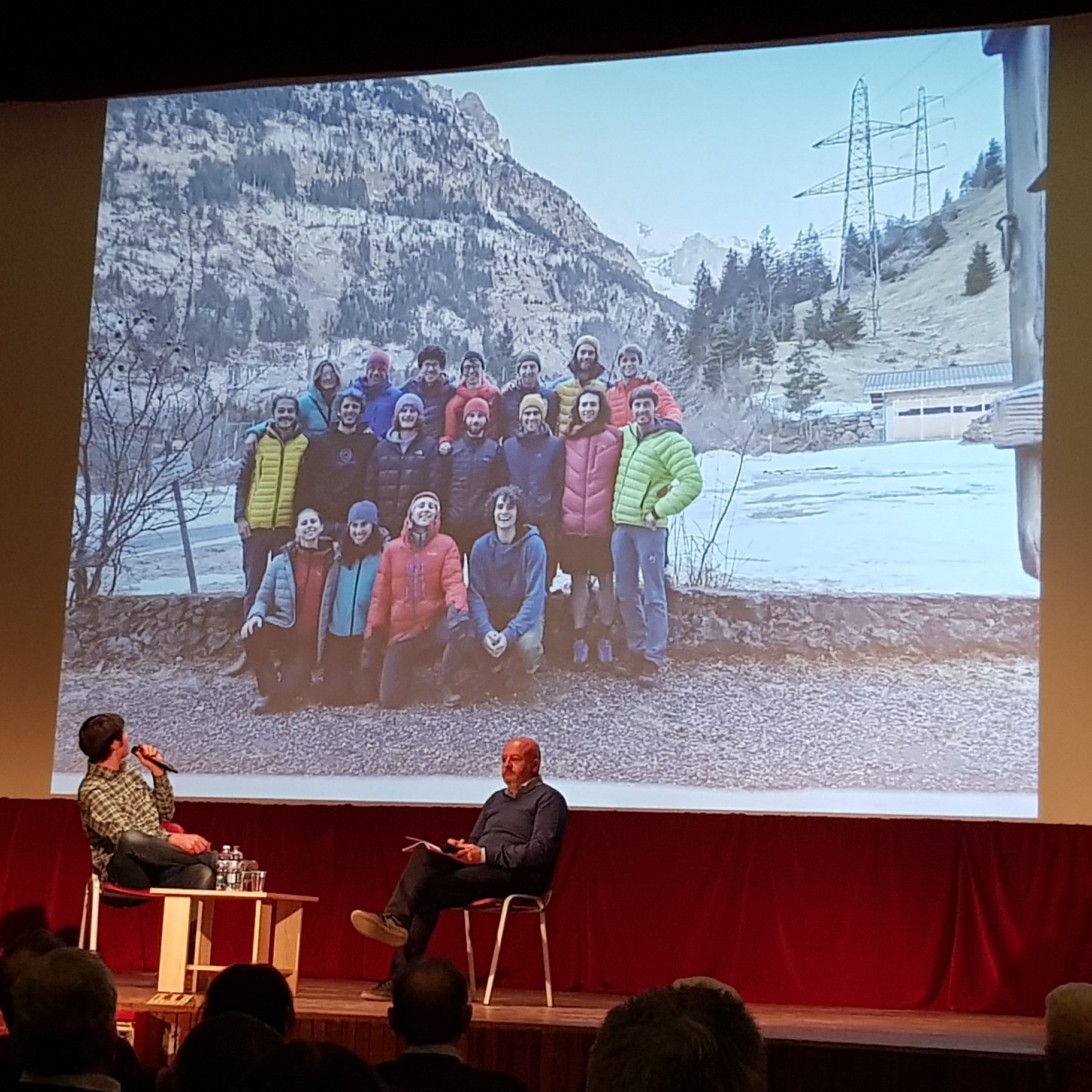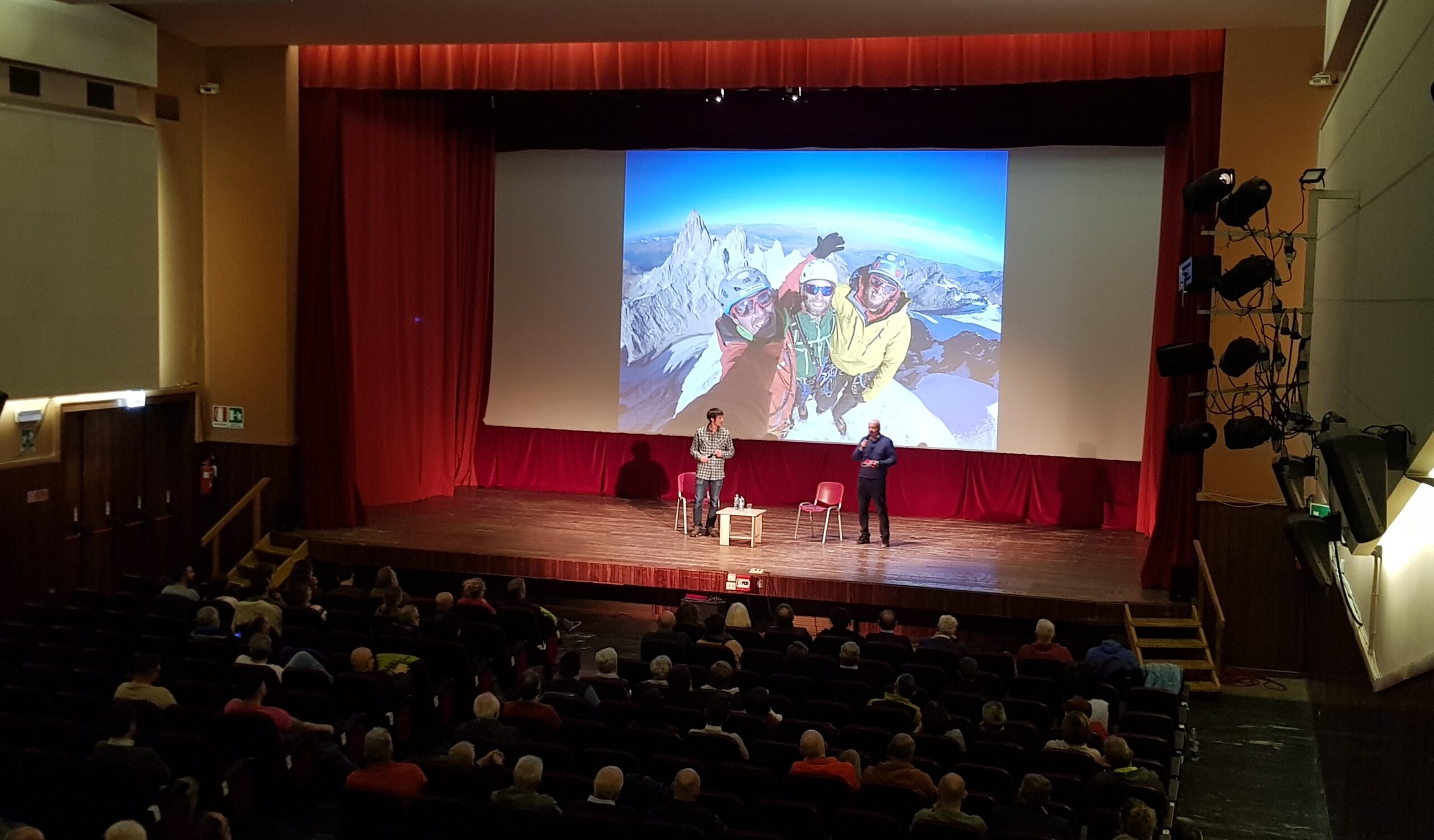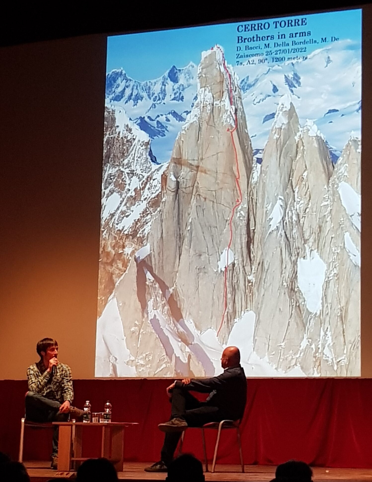 Le coppie di parole scelte per la serata dal Vice-Sindaco del Comune, Giacomo Tamborini e rilanciate dal giornalista Marco De Ambrosis con Della Bordella sono state: Uomini / Montagne e Montagna / Solidarietà. Sono parole che ci caratterizzano, le sentiamo nostre, sono nel DNA del nostro Comitato e Della Bordella le ha utilizzate come un navigato conferenziere parlando della sua vita di alpinista/esploratore durante la quale la montagna, la sfida, il successo si sono spesso intrecciati con la tragedia della perdita di amici, come i due Matteo e Korra Pesce. Ne è uscito, però, non il quadro di un alpinista che mette in conto tutto e che poi volta pagina – the show must go on! – e va avanti per la sua strada di sfide; ma l’affresco di un uomo, ora anche padre, che gioca fino in fondo la vita che si è scelto e per la quale sente di dover scommettere tutto il suo talento; guardando però anche ai giovani, cominciando ad assumere l’ottica del mentore, sapendo che molti di loro lo guardano con ammirazione e come modello.