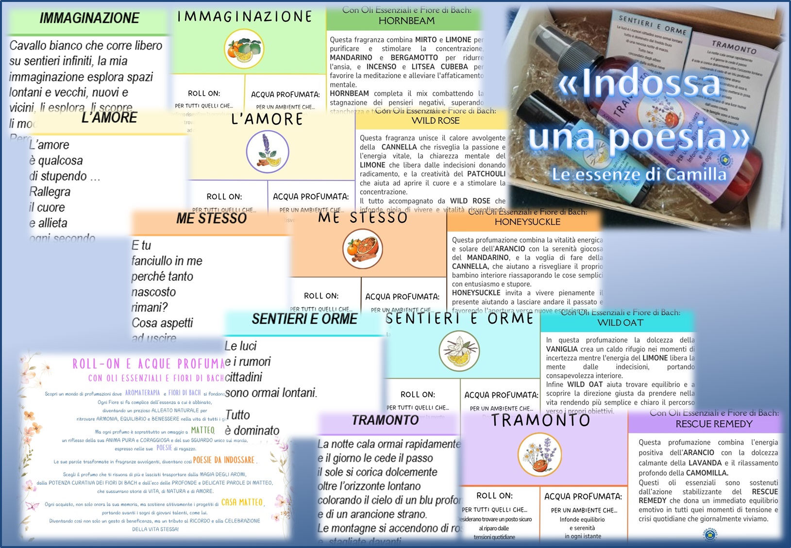 Camilla ha preparato per te acque profumate con oli essenziali e fiori di Bach in pratici dispenser spray per ambienti e comodi roll-on da portare sempre con te, abbinati ad una poesia scritta da Matteo.