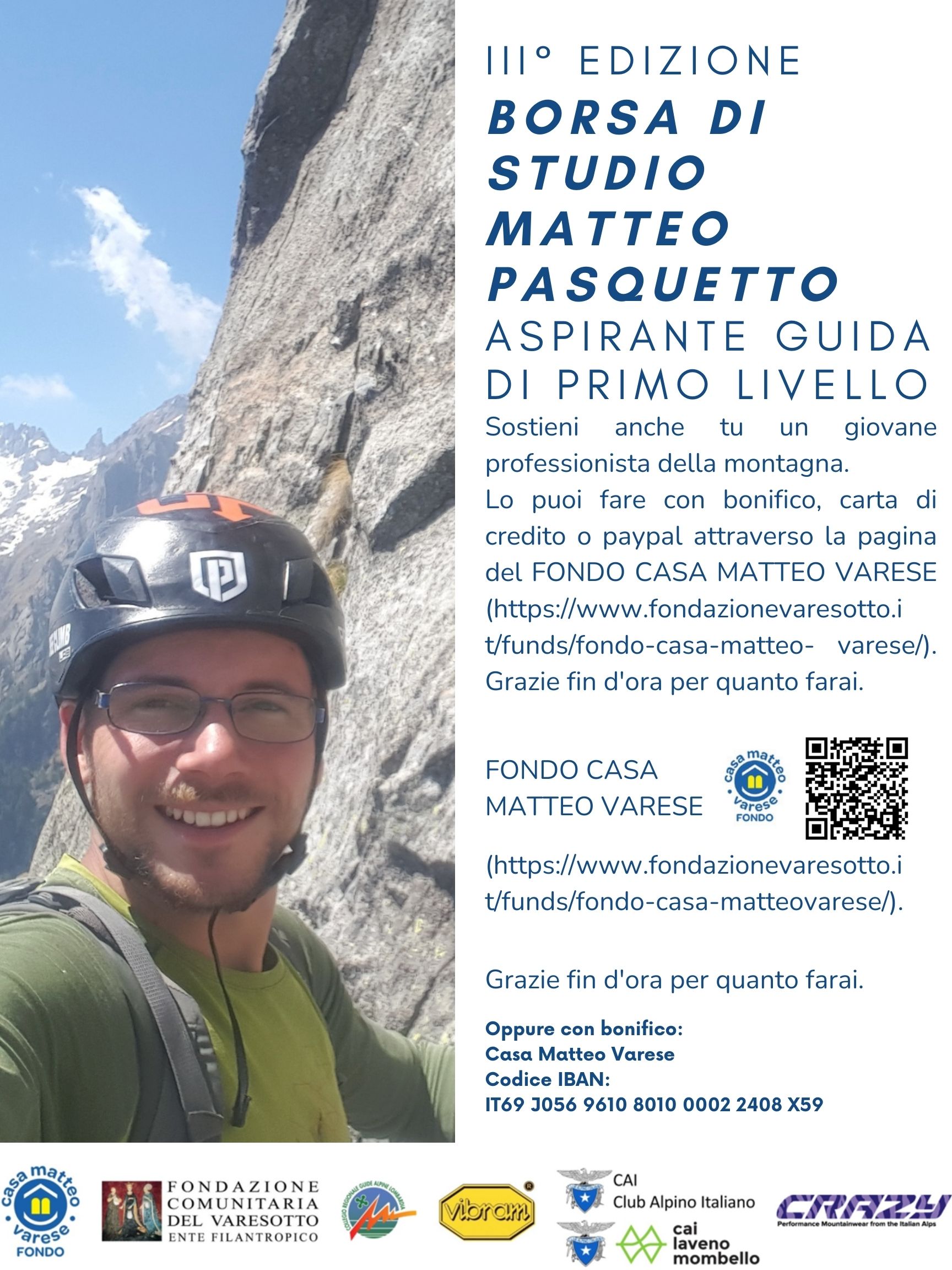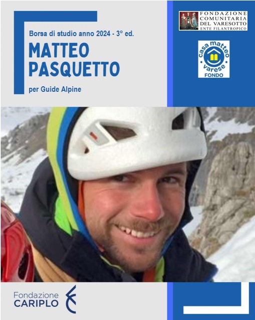 In autunno, come lo scorso anno, lo staff di Fondazione Comunitaria del Varesotto e Fabrizio Pina, Presidente del Collegio delle Guide Alpine di Lombardia hanno messo a punto il Bando per la terza edizione della Borsa di Studio Matteo Pasquetto per Aspirante Guida Alpina di 1^ Livello. Quest’anno hanno contribuito alla Borsa di Studio VIBRAM, il CAI centrale, la sede CAI di Laveno Mombello e, ancora una volta Crazy con una borsa di prodotti.