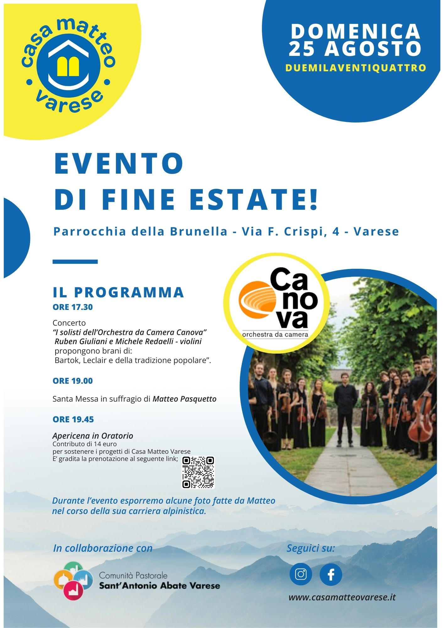 L’estate prosegue e si chiude con l‘Evento di fine estate presso la Chiesa e l’Oratorio della Brunella; quest’anno, il 25 agosto, Enrico Pagano ha selezionato un duo di violini, apprezzato dal pubblico che segue Casa Matteo; è seguita la messa, animata dagli amici guidati dalla vulcanica Federica; ci siamo poi trasferiti alla casetta dell’Oratorio per gustare le prelibatezze preparate da Fiorenzo e dalla sua squadra. Il tempo bello ci ha consentito di chiacchierare con gli amici nel cortile dell’oratorio in una tiepida serata di fine estate.